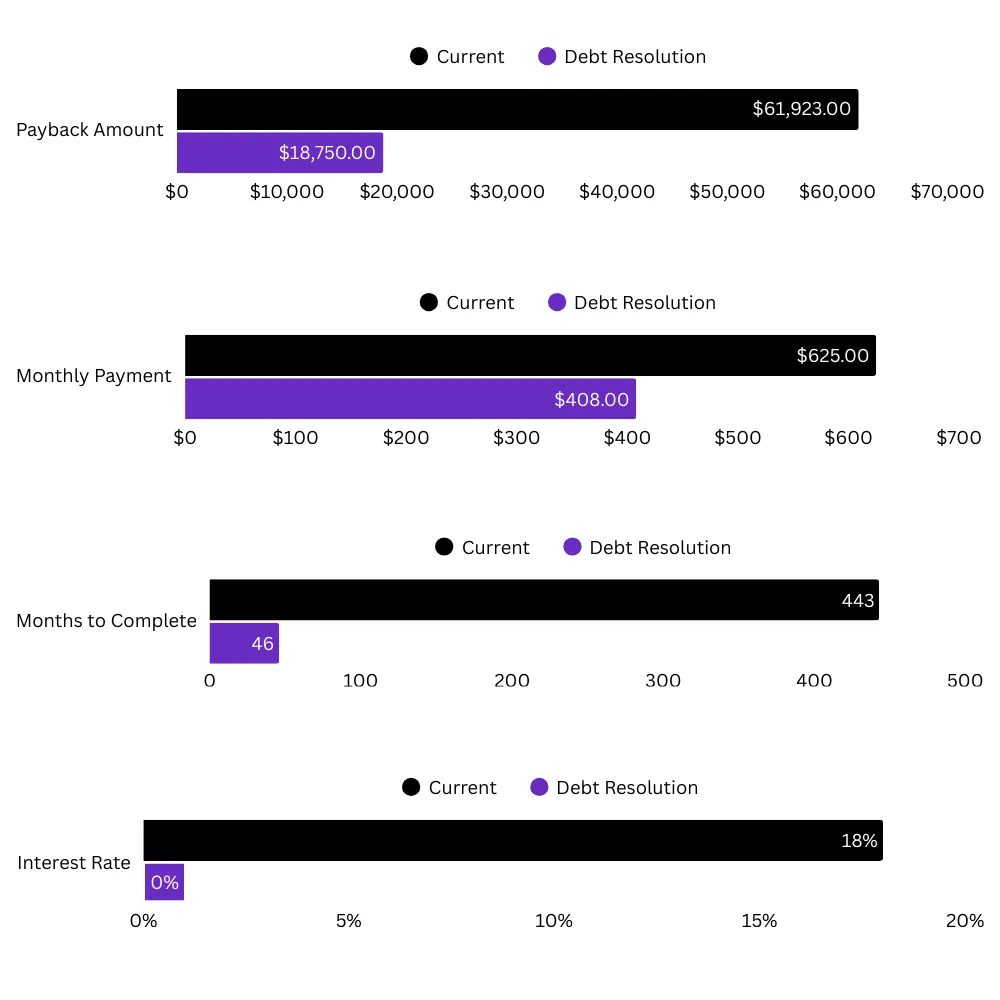With our program, you could pay it off in less than 48 months, & only pay $18,750. Plus, save over $200 each month!